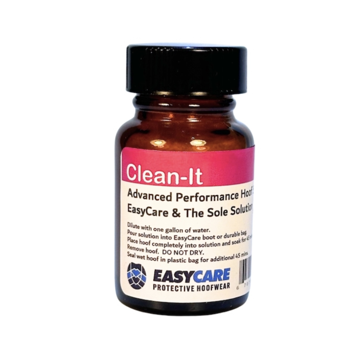 Clean-IT is a deep, penetrating hoof cleanser proven to be effective in eliminating even the toughest infections. Purges bacteria, fungi and spores from the deepest hoof layers and crevices, while removing dead, powdery soft remnants of tissue destroyed by fungal activity. Often effective with just one application. Mix entire bottle with one gallon water. Soak hoof for 30-60 minutes. Store the bottle in a refrigerator or a
