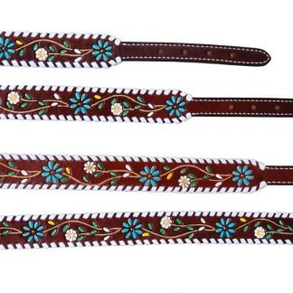 Browband Headstall with floral tooling in TT Finish, Painted Floral Vine & White Whipstitch