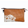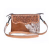 Rafter T Crossbody Purse with Brown Hair on Hide and a Tooled Flap