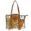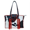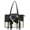 Tote Bag: Colored whipstitching with Hair on Hide Tote and a Tooled leather flap.